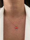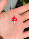 This is a 14k enamel red and gray mushroom with flush set diamonds. It is approx 18.9mm with the bail. Bail is small at 4.5mm. Chain not included- it is approx 1.3g