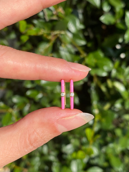 14k pink enamel diamond rectangular huggie earrings