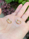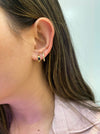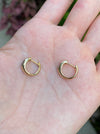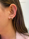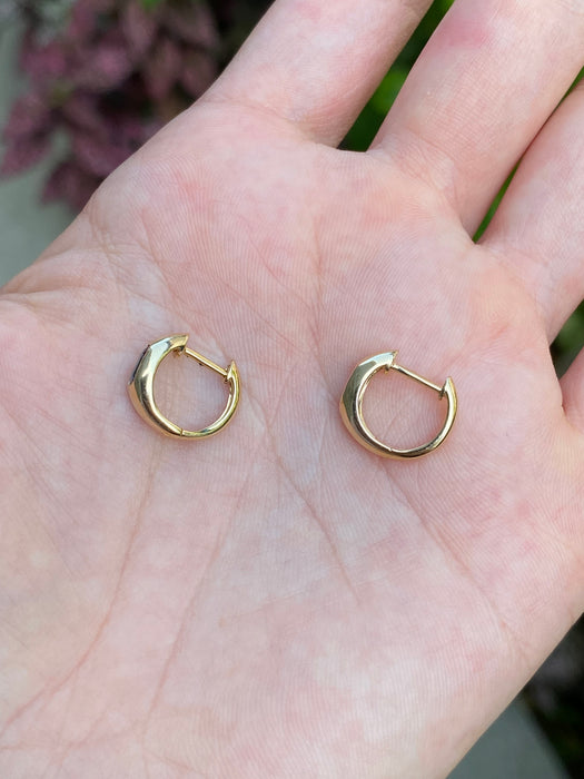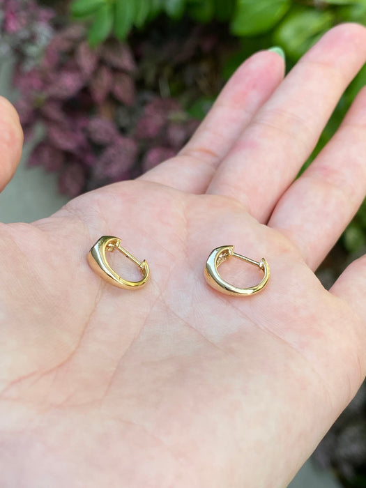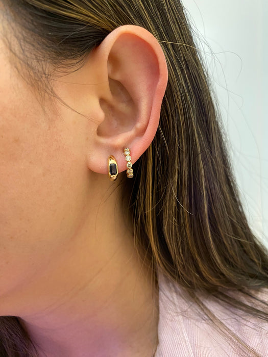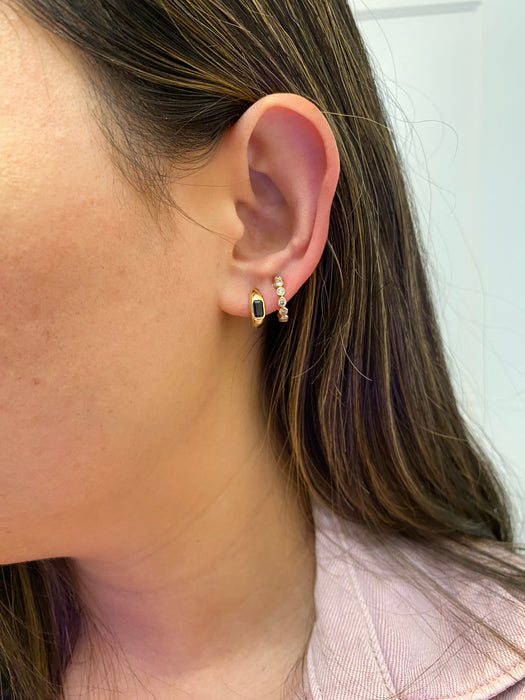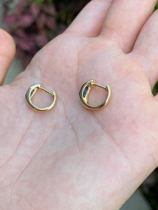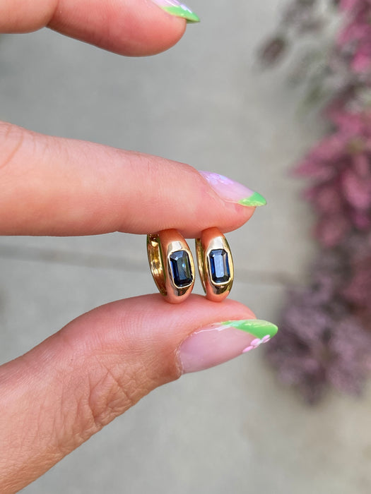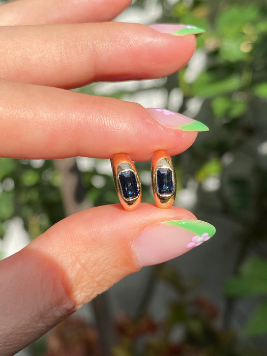 This is a pair of 14k blue sapphire emerald cut flush set huggie earrings. They measure approx 11.5mm top to bottom, and 4.5mm wide and 12.8mm diameter