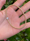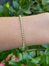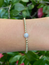 This is a 14k stretchy bead bracelet with diamond bead charm. It is approx 5.8g and has 0.3 tcw diamonds m. It is 7” and has a 2.25” diameter. It is slightly stretchy and does not have a clasp