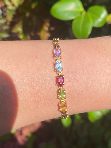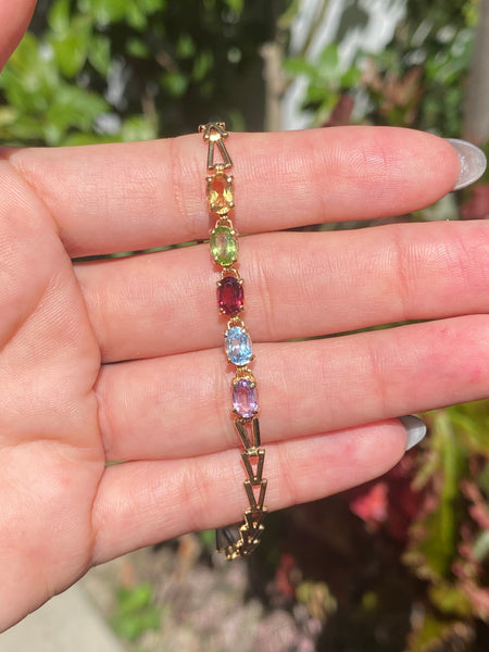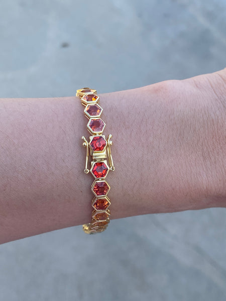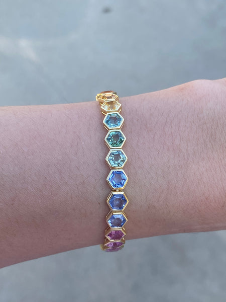 14k bezel set hexagon rainbow sapphire bracelet 7”