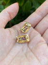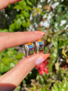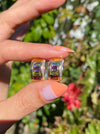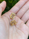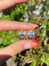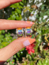 This is a set of vintage 14k rainbow diamond omega earrings. They are approx 5g. They have 0.12 tcw diamonds, emerald cut garnet, blue topaz , citrine, amethyst and peridot . They measure approx 18.5mm top to bottom and 9.7mm wide