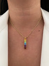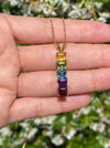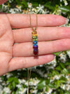 This is a vintage 18k rainbow princess cut pendant. It has citrine, peridot, blue topaz; amethyst and garnet. It is approx 4.2g . It is 31.6mm in length and 6.3mm wide . Chain not included