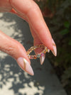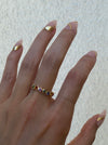 This is a 14k bezel set rainbow sapphire heart ring. It has 2.4 carats of rainbow sapphire hearts. It is size 7.5 and not sizable