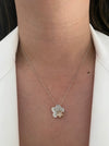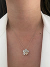 This is a vintage 18k white gold bead chain with 18k white gold and rose gold diamond flower pendant. The charm comes off the chain. The charm has 0.51 tcw diamonds. The chain is 18” and can be adjusted to most lengths shorter. It is approx 4.3g