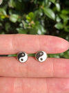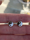 These are 14k white enamel yin yang diamond stud earrings.  They measure approx 9mm and come with 14k push backings. They are a set of 2