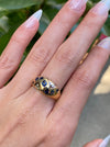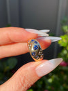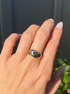 This is a vintage 18k flush set blue sapphire diamond ring. It is size 6.5 and sizable. It is approx 5.8g. It has natural diamonds and blue sapphires