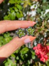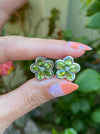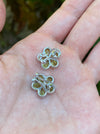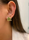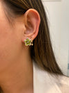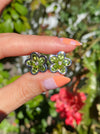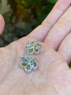 This is a pair of vintage 14k white gold bezel set peridot and diamond flower omega back earrings. They are approx 5.4g and 4.6 carats of peridot . They have 0.04 tcw diamonds. They measure approx 13.8mm in length and 14.1mm in width