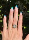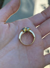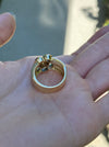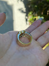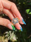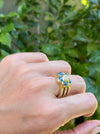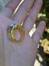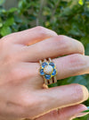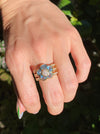 This is a vintage 18k blue topaz cabochon and diamond flower ring. It is 10.6g and size 5.5- but does fit tighter due to width- it can be sized. It has 2.93 tcw blue topaz & 0.41 tcw diamonds