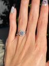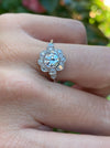 This is a platinum 900 vintage possible antique diamond flower ring. It has an 0.74 tcw diamonds with 0.55 tcw old mine cut diamond center. It is approx 3.4g. It is size 6.25 and sizable