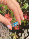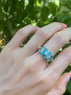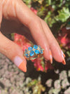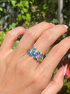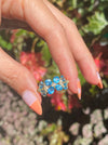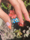 This is a vintage 18k blue topaz diamond flower ring. It is size 6 and resizable. It is approx 4.8g
