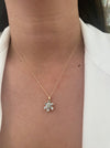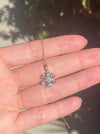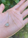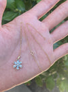 This is a 14k yellow gold delicate Singapore chain with 14k yellow gold diamond aquamarine flower pendant. Charm comes off. Chain is 18”. The charm hangs approx 17mm with the bail.