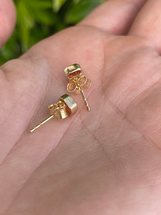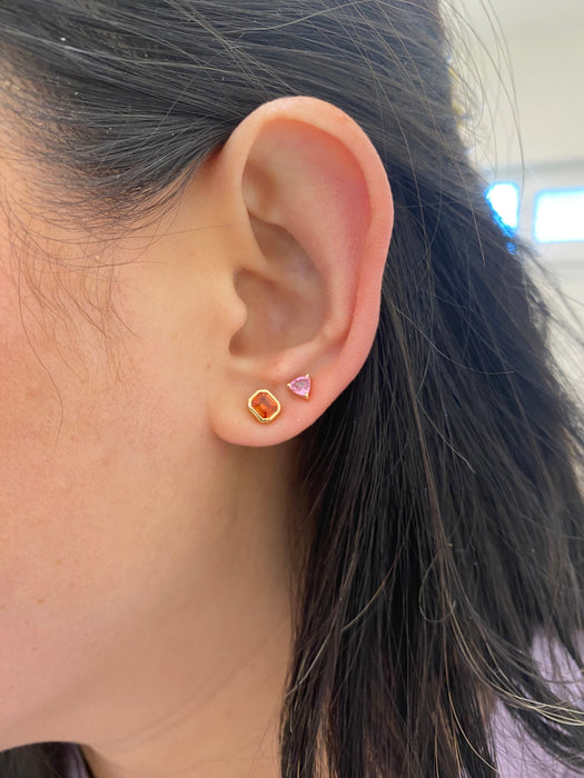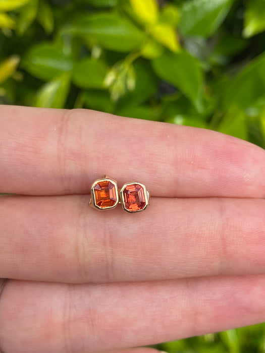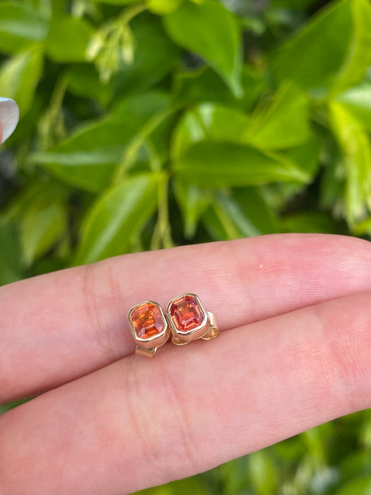 This is a set of 14K bezel set natural orange sapphire - emerald cut stud earrings. They are 1.06 tcw sapphires. They come with 14k push backings . They are approx 4.9mm by 5.8mm