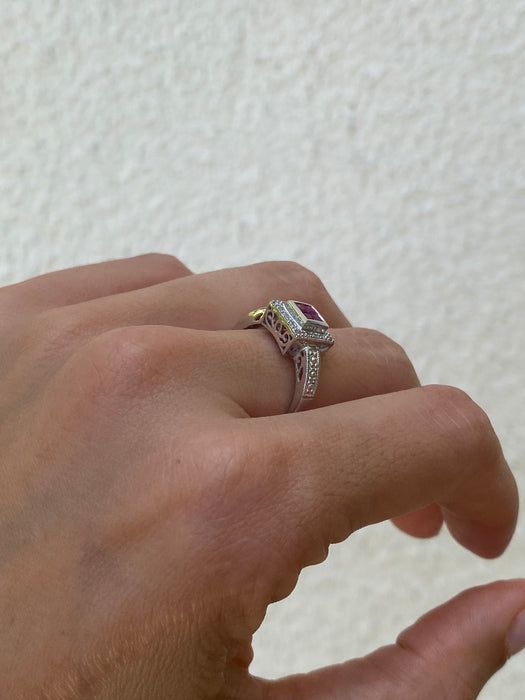 This is a vintage 14k white gold invisible set ruby and diamond ring. It is size 7.25 and resizable
