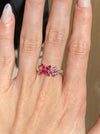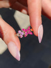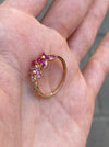 This is a 14k rose gold diamond pink sapphire and ruby flower ring. It is size 7 and sizable