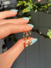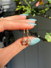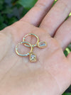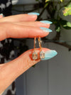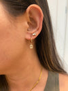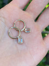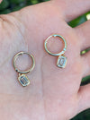 This is a pair of 14k huggie earrings with lab diamonds. They have approx 1.5 tcw lab emerald cut diamonds. They are VS E/F color. The huggie is appeox 13.2mm top to bottom, 13.5mm diameter and 1.4mm wide. The diamond hangs an additional 7.2mm