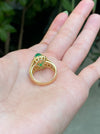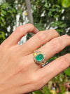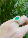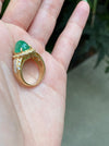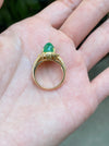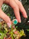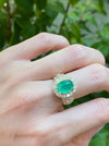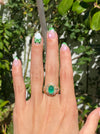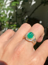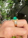This is a vintage 18k diamond cabochon emerald ring. It has a juicy 3.7 carat cabochon emerald. It has 0.71 tcw round brilliant diamonds and 0.64 tcw step cut diamonds. It is approx 8.5g. It is size 5.5 and resizable .